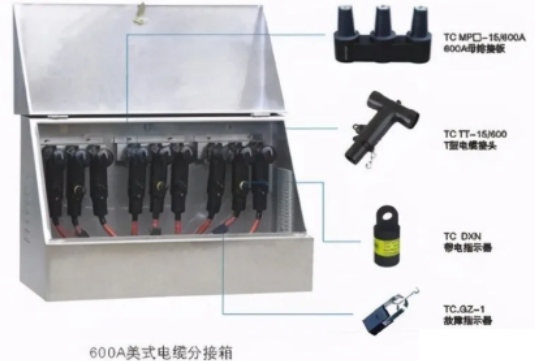 1)美式電纜分支箱,它以單向開門、橫向母排為主要特點,具有寬度小、組合靈活、全絕緣、全密封等顯著優(yōu)點。600A主回路采用旋入式螺栓固定連接;分支回路采用拔插式連接。