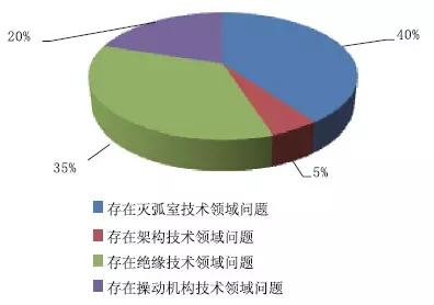 經過對固體絕緣環網柜中心技術問題的了解,認為存在滅弧室技術領域問題的占比40%;認為存在架構技術領域問題的占比5%;認為存在絕緣技術領域問題的占比35%;認為存在操動安排技術領域問題的占比20%。如圖9所示。