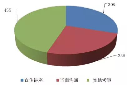 經過了解參與者了解新產品知識的途徑,認為最有用的辦法中:宣揚講座的占比30%;可以經過當面交流的占比25%;可以參與實地考察的占比45%。如圖16所示。