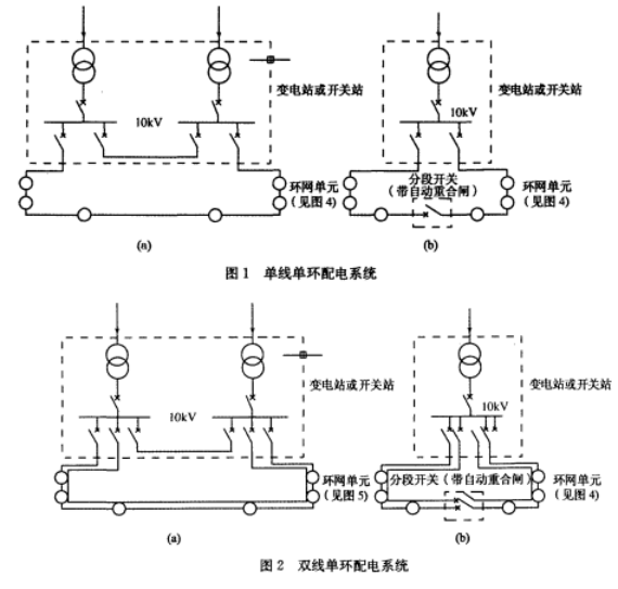 2006年1月正式實施的江蘇省當地規范《江蘇省工程建造規范》DGJ31/J14-2005中規定,配所--般應優先選用環網單元(環網單元是指環式配電體系中配電所的體系接線)。可見環式配電體系是10kV配電體系的推薦體系和開展方向。